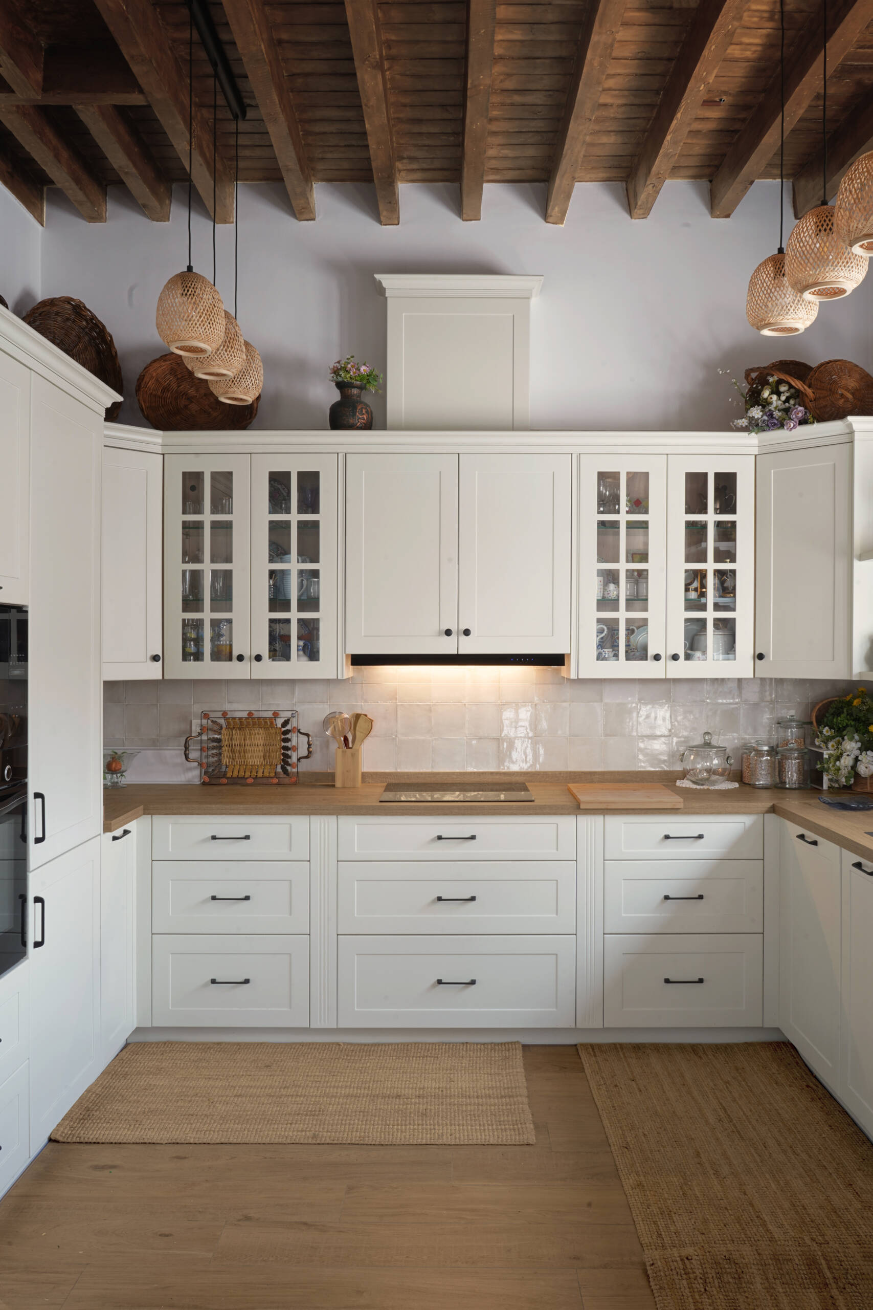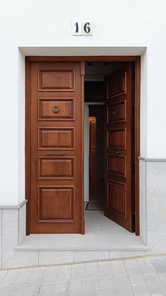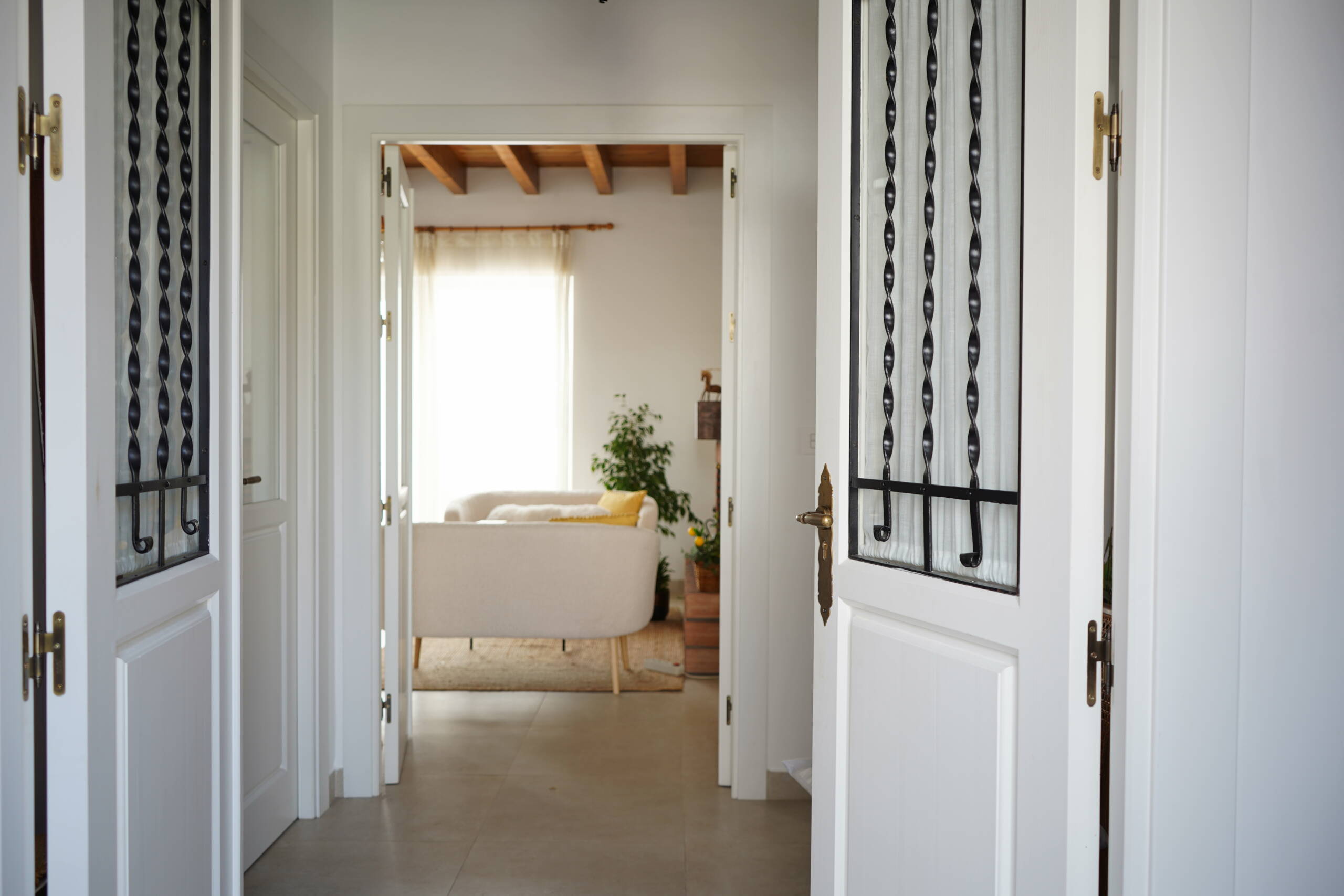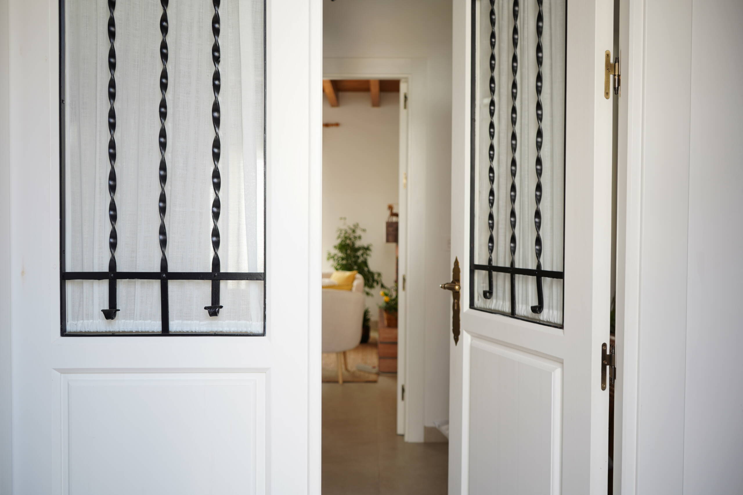 Natural solid wood plays a key role in the design, always in a dark tone but with two distinct finishes. For unique elements, such as the main door, ceilings, and select furniture pieces, a dark varnish is applied to highlight the grain of the material. On the other hand, for passage carpentry and wardrobes, a matte black lacquer is used, aligning with the exterior metalwork. Both finishes integrate seamlessly into the overall design and are enhanced by brass details and hardware.
