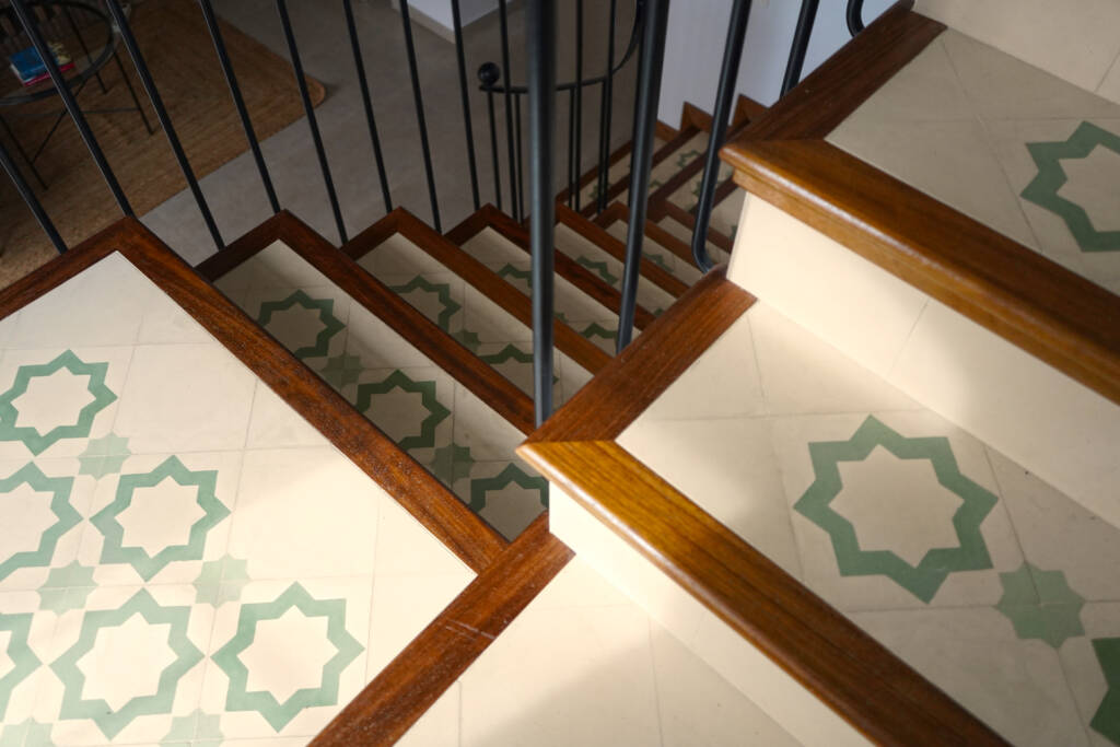 Traditional materials such as lime mortars for vertical coatings, Granadian pebble stone for special pavements, and primarily terracotta—serving as the unifying element of the project—are used. These are combined with noble materials, such as bush-hammered marble for flooring and cladding, and black Marquina marble for standout elements like the fireplace.